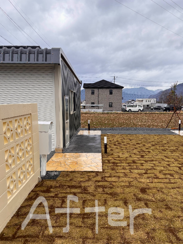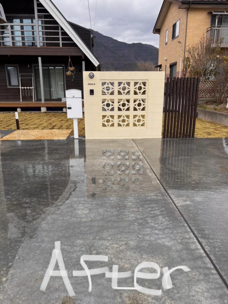 土間コン・芝貼り・アプローチ・門柱・フェンス等を施工させていただきましたが、中でもデザインブロックでの門柱はおしゃれで目を惹きますね✿